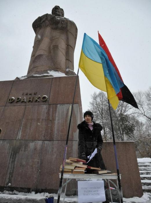 Сьогодні зранку у Львові на площі перед Львівським університетом ім. І.Франка близько двох десятків студентів влаштували акцію протесту проти призначення міністром освіти й науки Дмитра Табачника. З плакатами "Геть Табачника — україножера", "Проти русифікації, корупції, перепису історії" вони збирали на макулатуру радянські підручники.