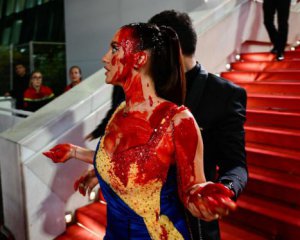 Українська блогерка Ілона Чернобай вийшла на червону доріжку Каннського кінофестивалю 2023 у жовто-синій сукні, яку потім публічно облила штучною кров'ю.