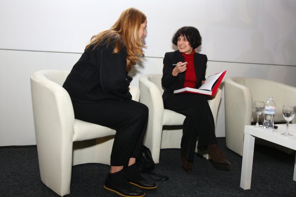 Після презентації кілька гостей підійшли до Звиняцьківської, щоб сфотографуватися та підписати щойно придбані книги її авторства. Вартість однієї - 990 гривень. Дівчина років 16 в сірих брюках з високою талією захоплено підбігає до автора. Проситься стати її асистенткою. Звиняцьківська фотографує її номер телефону.