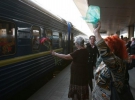 Під звуки військових маршів і "Прощання слов'янки" фронтовиків проводжали чиновники, близько десятка школярів, пасажирів інших потягів і просто перехожі. Вікна ветеранських вагонів (їх причепили до потягу N6 "Київ-Москва") прикрасили наклейками у вигляді георгіївських стрічок і написів "Слава ветеранам".