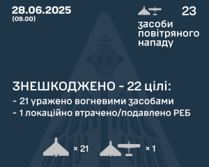 До 09:00 сили протиповітряної оборони знищили 22 ворожі дрони. З них 21 знищено вогневими засобами, ще один втрачено з локації або подавлено за допомогою радіоелектронної боротьби.
