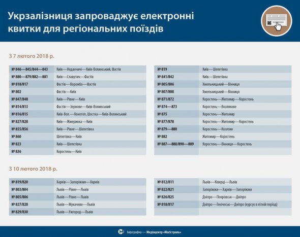 "З 7 та з 10 лютого через інтернет можна придбати квитки на більшість регіональних поїздів (800-ї нумерації) з оформленням електронного проїзного документа. Його не потрібно обмінювати у залізничних касах на звичайні", - йдеться у повідомленні.