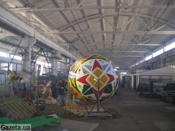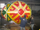 "Підготовчі роботи ми розпочали ще у лютому, – розповіла голова Черкаського обласного осередку Національної спілки народних майстрів України Ольга Мартинова. – Розкреслювати орнамент мені допомагав син, який за освітою архітектор. Адже маленьке яйце я знаю як ділити на дольки, а от з такими розмірами важкувато. Щодо фарб – то такі використовуються для зовнішніх робіт, тому працювати доводилось у респіраторі".