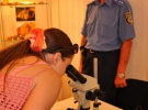 За її спиною відвідувачі розглядають в мікроскоп комаху, що застигла в смолі 40 млн років тому.