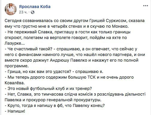 Також, як випливає з поста журналістки, Суркіс пообіцяв звозити її в Монако після того, як закінчиться карантин.