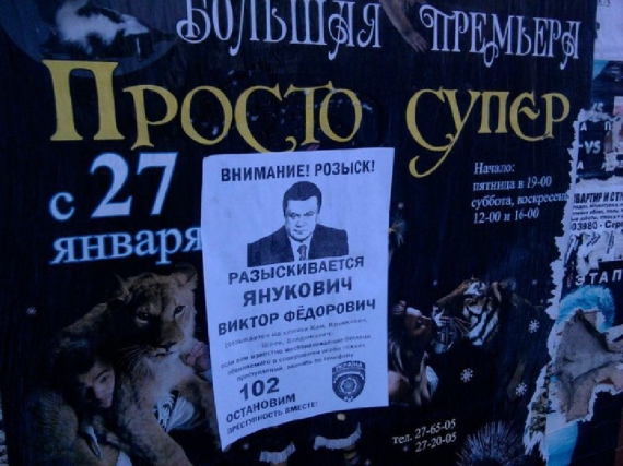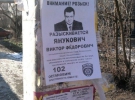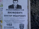 "Шукаємо Януковича* Віктора Федоровича (відгукується на клички Хам, Ялинкович, Шрек, Бандюкович). Якщо вам відоме місцезнаходження втікача, обвинуваченого в скоєнні особливо тяжких злочинів, дзвонити по телефону 102. Зупинимо злочинність разом!" - значиться на листівках.