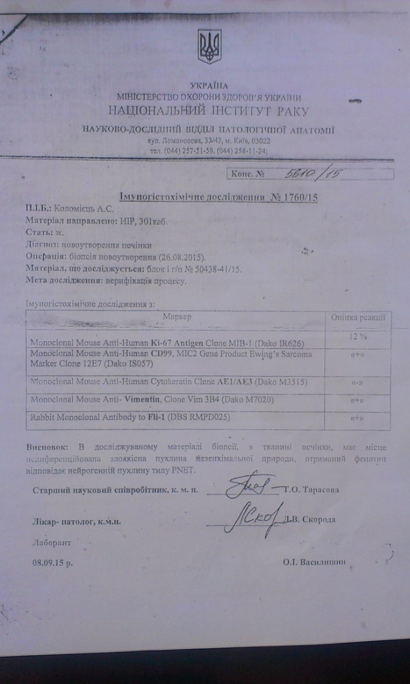 "Про хворобу дізналися, коли оформляли доньку в дитсадок. Їй тоді було два роки. Проходили медогляд. Аналізи показали, що в неї низький гемоглобін. Нам порадили звернутися в онкологію. Лікарі виявили у Насті злоякісну пухлину. Вона мала розмір п'ять чи сім з половиною сантиметрів", - розповідає Gazeta.ua батько Сергій Коломієць.