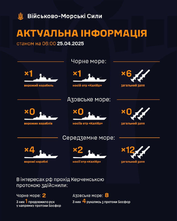 Станом на ранок 25 квітня у Чорному морі один ворожий корабель, який є носієм крилатих ракет "Калібр" загальним залпом до шести ракет.