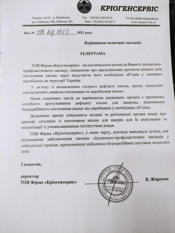 Керівництво міської лікарні Вознесенська Миколаївської області отримало термінове повідомлення від ТОВ "Криоген", яка постачає кисень для апаратів штучної вентиляції легенів.