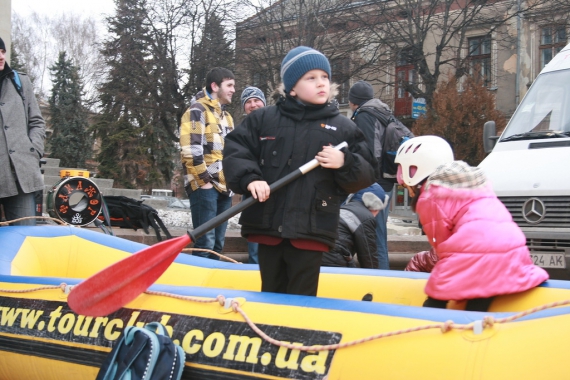 Тернопільські туристи винесли на центральний майдан міста катамарани і байдарки, таким чином протестуючи проти побудови ГЕС в Карпатах.
