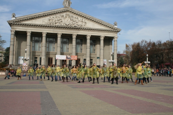 Півсотні студентів з місцевого економічного університету затанцювали на центральному майдані Тернополя в дощовиках та з парасолями в руках, аби привернути увагу людей до теми підписання угоди про асоціацію між Україною та ЄС.