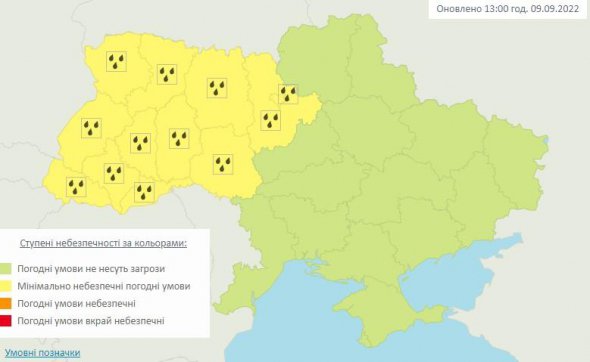"10-11 вересня у західних, північних, Вінницькій, Черкаській, Кіровоградській, на півночі Одеської та Миколаївської областей пройдуть значні дощі, місцями можливі грози та пориви вітру 15-20 м/с", – йдеться у повідомленні.