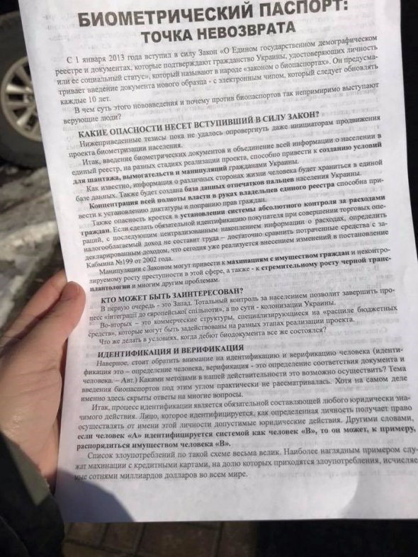 "У хід ідуть найстрашніші аргументи. Наприклад, серед "небезпек біометричних паспортів", як знову ж пише їхня листівка, - махінації з власністю і стрімкий зріст чорної трансплантології. Зацікавлений в цьому, звичайно, Захід, щоб завершити процес "інтеграції до європейської спільноти", - додала Янченко.