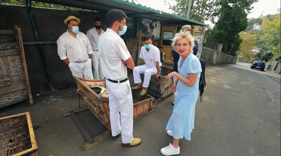 "Ці сані тут називають "карру де сешту". У ХІХ ст. вони слугували місцевим громадським транспортом. На них спускали вантаж та людей з гірського села Монте до підніжжя гори. А зараз це найбільш відома розвага на острові Мадейра", – розповідає ведуча.