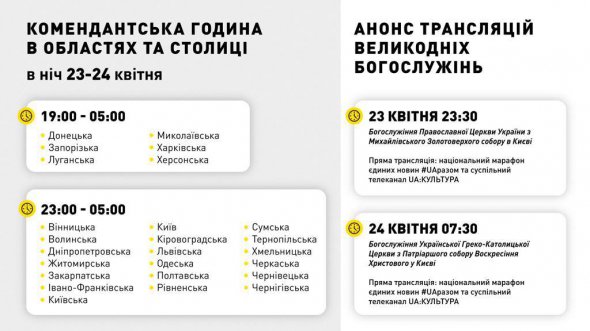 Вінницька, Волинська, Дніпропетровська, Житомирська, Закарпатська, Івано-Франківська, Київська, Кіровоградська, Львівська, Одеська, Полтавська, Рівненська, Сумська, Тернопільська, Хмельницька, Черкаська, Чернівецька та Чернігівська області і столиця - місто Київ - закриті з 23:00 23 квітня до 5:00 24-го.