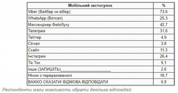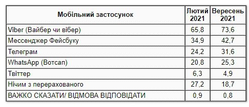 Динаміка використання мобільних додатків показує, що більше стали використовувати Viber (з 65,8% до 73,6%), мессенджер Facebook (з 34,9% до 42,7%) та Telegram (24,2% до 31,6%).