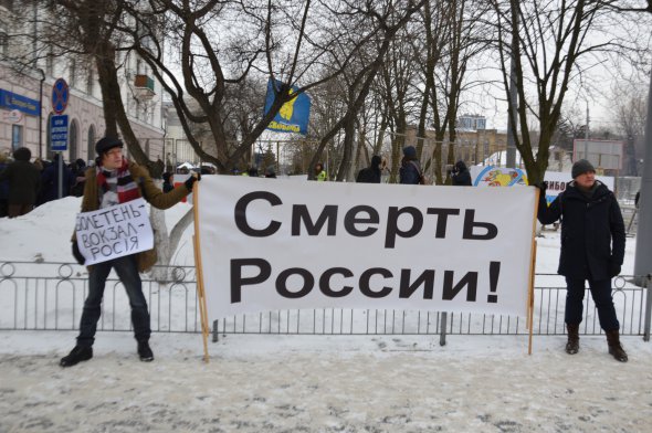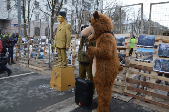 З однієї з сторін зібралися активісти з "Правого сектора", ВО "Свобода" й Національного корпусу. Влаштували перформанс із ведмедем з балалайкою, золотою лялькою з людиною схожою на російського президента Володимира Путіна.