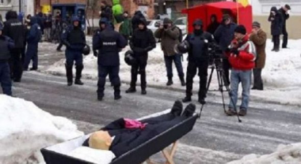 У Харкові Також вхід до консульства заблокували поліцейські й актитвісти. Останні принеси до російського консульства стилізовану труну з лялькою в середині.