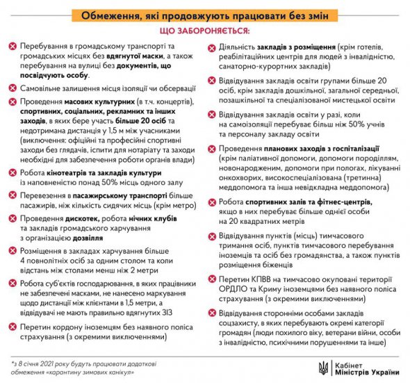 · роботу закладів громадського харчування з 23:00 до 07:00 (крім роботи на винос і на доставку) та проведення розрахункових операцій після 22:00. Проте в ніч із 31 грудня на 1 січня робота ресторанів і кафе буде дозволена до 01:00.