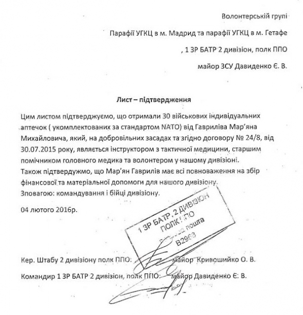 Згодом, українська громада Мадрида отримала від Мар'яна фото-звіт про передачу бійцям продуктів та індивідуальних аптечок. Також від нього надійшов лист-підтвердження з печаткою військової частини В2968. Та виявилось, командування частини нічого про це не знає.