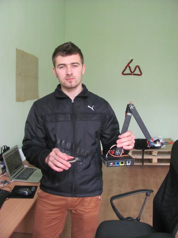 "Робота механізму дуже проста. Хворому головне привчитися керувати роботом. Спеціальний механізм кріпиться до руки. Він передає інформацію до робота, той в свою чергу повторює рухи людини. Переносить чашку чи подає ліки" - каже студент.