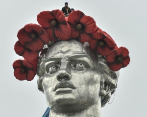 Монумент "Батьківщина-Мати" у Києві до Дня пам'яті загиблих у Другій світовій війні прикрасив вінком із червоних квітів зі стрічками руфер Mustang.