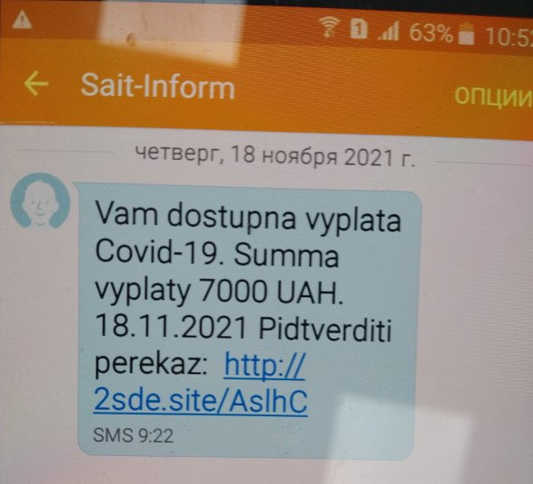 "Клієнтам через месенджери та електронну пошту приходять повідомлення про доступні виплати за вакцинацію на кілька тисяч гривень. Далі шахраї пропонують перейти за посиланням на фальшиву сторінку сайту та заповнити особисті дані та реквізити банківських карток", - йдеться у повідомленні.