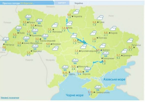 17 березня у південних і східних областях місцями значні опади, у Карпатах сильний сніг. На дорогах місцями утвориться ожеледиця.