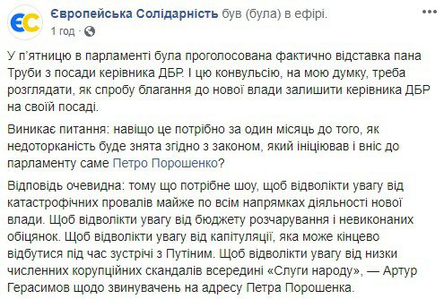 "У п'ятницю в парламенті була проголосована фактично відставка пана Труби з посади керівника ДБР. І цю конвульсію, на мою думку, треба розглядати, як спробу благання до нової влади залишити керівника ДБР на своїй посаді. Виникає питання: навіщо це потрібно за один місяць до того, як недоторканість буде знята згідно з законом, який ініціював і вніс до парламенту саме Петро Порошенко? Відповідь очевидна: тому що потрібне шоу, щоб відволікти увагу від катастрофічних провалів майже по всім напрямках діяльності нової влади. Щоб відволікти увагу від бюджету розчарування і невиконаних обіцянок. Щоб відволікти увагу від капітуляції, яка може кінцево відбутися під час зустрічі з Путіним. Щоб відволікти увагу від низки численних корупційних скандалів всередині "Слуги народу"", - заявив Герасимов.