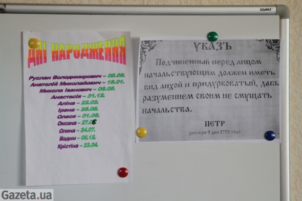 Із дверей видно офісну дошку оголошень. На першому з двох папірців - дні та місяці народження всіх 11 працівників компанії. На другому - ксерокопія Указу Петра Першого із текстом: "Подчиненный перед лицом начальствующим должен иметь вид лихой и придурковатый, дабы разумением своим не смущать начальства".
