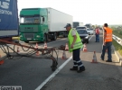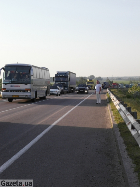 За 5 хв на міст з'їхала колона з полтавською опозицією - один великий автобус і більше десяти автомобілів. Ремонтники повністю перекрили рух. У сто чи більше метрів вишукувалась колона з автотранспортом.
