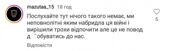 Незабаром з'явилася реакція учасників скандальної дискотеки. Вони заявили, що "втомилися від війни" та "живуть життя", а патріотам порадили слухати "ваньку-встаньку".