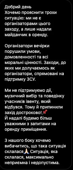 Крім того, в мережі з'явилася заява нібито адміністрації клубу Muza-Bar Club, у якій стверджується, що вечірку з російськими піснями організував не заклад – приміщення нібито було здано в оренду.