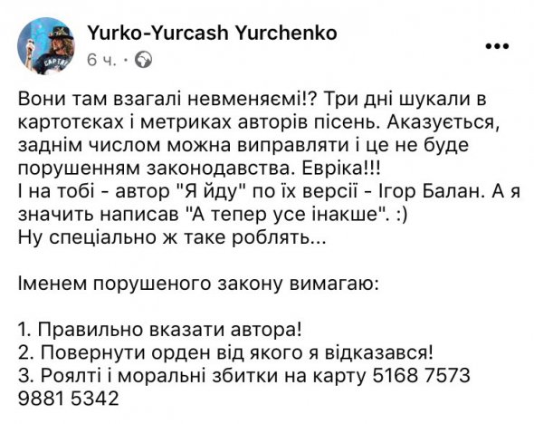 "Вони там взагалі невменяємі!? Три дні шукали в картотєках і метриках авторів пісень. Аказується, заднім числом можна виправляти і це не буде порушенням законодавства. Евріка!!! І на тобі - автор "Я йду" за їхньою версією - Ігор Балан. А я значить написав "А тепер усе інакше". Ну спеціально ж таке роблять", - написав музикант у Facebook.