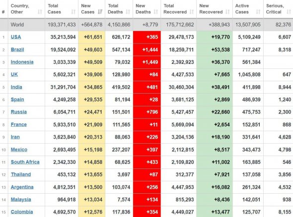 Загалом за час пандемії у світі померли понад 4,1 млн людей, одужали від недуги - 175 млн. За добу діагностували понад 564 тис. нових випадків Covid-19. Найбільше хворих виявили в США, Бразилії та Індонезії.