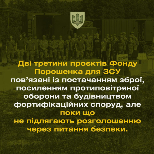 Загалом Фонд Порошенка за цей час надав допомогу більш ніж 200 військовим частинам - бригадам, полкам та батальйонам. Дві третини проєктів повʼязані із постачанням зброї, посиленням протиповітряної оборони та будівництвом фортифікаційних споруд і наразі не розголошуються з міркувань безпеки.