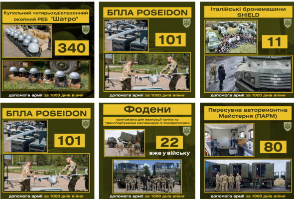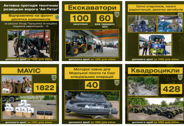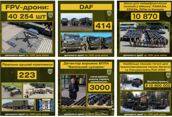 Для військових закуплені сотні вантажівок, десятків тракторів, приладів нічного бачення, снайперських прицілів Archer, сотень "Старлінків", тисяч цифрових радіостанцій, десятків автобусів, іншого обладнання. Зокрема, для потреб фронту були куплені 414 військових вантажівок DAF, які після технічного обслуговування та переоснащення надійшли у війська.