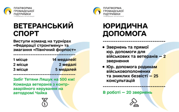ГО "Платформа громадської підтримки" - новостворена але ефективна команда ветеранів, яка встигла зробити чимало за 3 місяці існування та має амбітні плани розвитку. Окрім Києва вже відкрито відділення ГО у Сумах, є плани розширення у інших регіонах нашої країни. Організація допомогає ветеранам, ВПО, військовим, родинам полонених та зниклих без вісті захисників. Надається гуманітарна допомога, працює юридична служба, здійснюється підтримка ветеранів через спорт, реабілітацію та адаптацію, надається допомога ВПО та родинам військових.