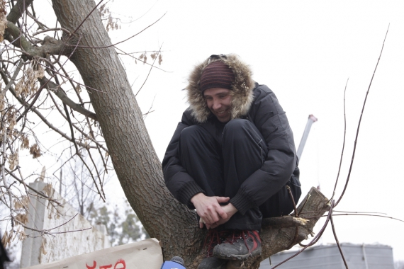Остання плита, яку встигли встановити будівельники, вперлась у чотириметровий клен. Будівельники намагались зрізати дерево. Люди не дозволили, узяли клен під цілодобову охорону. Біля стовбура навалили барикаду зі старих автомобільних шин та дощок. Сьогодні вранці учасниця акції протесту на ім'я Галина Михайлівна залізла на гілку. Просиділа кілька годин. Потім її на цьому посту змінив чоловік на ім'я Олексій.