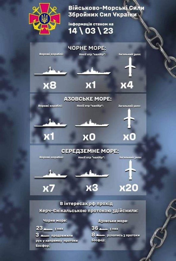 14 березня в Чорному морі на бойовому чергуванні знаходиться вісім ворожих кораблів.