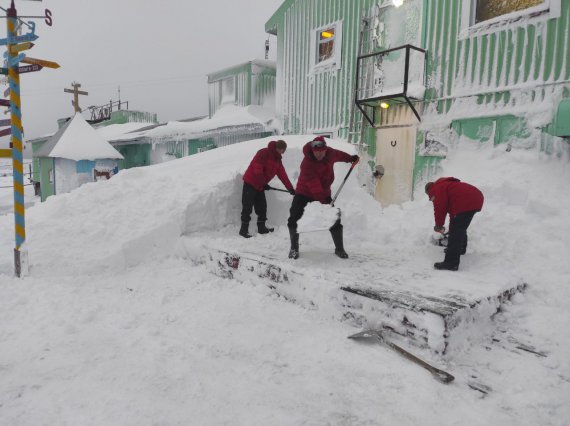 Майже два метри снігу намело за ніч. Тому будівлю по черзі відкопували очільник станції Богдан Гаврилюк, дизеліст Олександр Книжатков і механік Олександр Милашевський. Вони підготували додатковий генератор, відімкнули певну частину апаратури й установили аварійне світло.