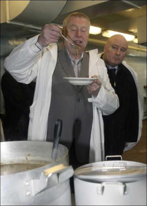 Після цього Жириновський пройшов у харчоблок СІЗО, де з цікавістю спостерігав за приготуванням їжі і навіть покуштував розсольник, який, втім, не викликав у нього захоплення. Зокрема, лідер ЛДПР завірив всіх присутніх журналістів, що в розсольнику замість м"яса використовуються консерви. Коли ж начальник СІЗО спробував оспорити це твердження, Жириновський проскандував: "Консерви! Консерви! Консерви!".