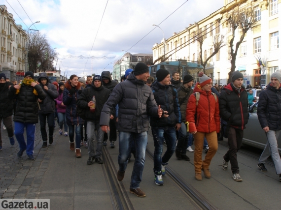 Студенти зустрічали депутатів, що не проголосували за радикальний варіант резолюції, криками "Ганьба!". Саме в цей час вулицею Соборною повз облдержадміністрацію пройшла колона із 500 молодиків, що закривали обличчя шарфами. Вони пускали димові шашки та шумові гранати.