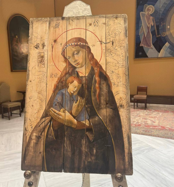 Президент України Володимир Зеленський розповів, що "Божа матір з немовлям" написана на фрагменті ящика з-під важких артилерійських озброєнь, привезеного з-під Ізюма. Він передав ікону Папі Римському Леву XIV.