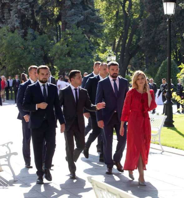 Він опублікував фото, де іде разом із Оленою та охоронцями. Жінка крокує попереду у довгій червоній сукні із розрізом на нозі. Образ доповнила розпущеним волоссям та мінімальним макіяжем.