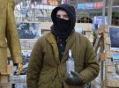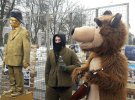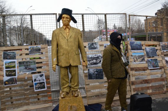 Активісти з "Правого сектора", Об'єднання "Свобода" на Національного корпусу розмістили на стенді, що перекриває вулицю, фото загиблих у російсько-українській війні українських воїнів. Також встановили "золоту" фігуру Путіна. Поряд із ним ходить із балалайкою переодягнений у ведмедя чоловік. Другий чоловік - у ватнику й вушанці тримає пляшку горілки.