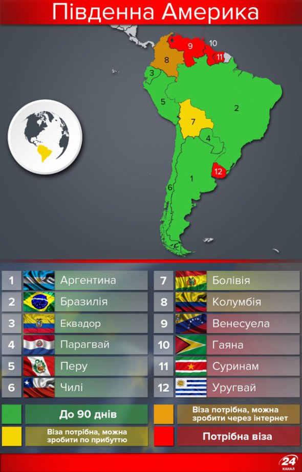 В Південній Америці безвізовий режим діє в 7 країнах: Аргентина, Бразилія, Еквадор, Парагвай, Перу і Чилі. Болівійську візу можна зробити по прибуттю, а в Колумбію - замовити через інтернет.