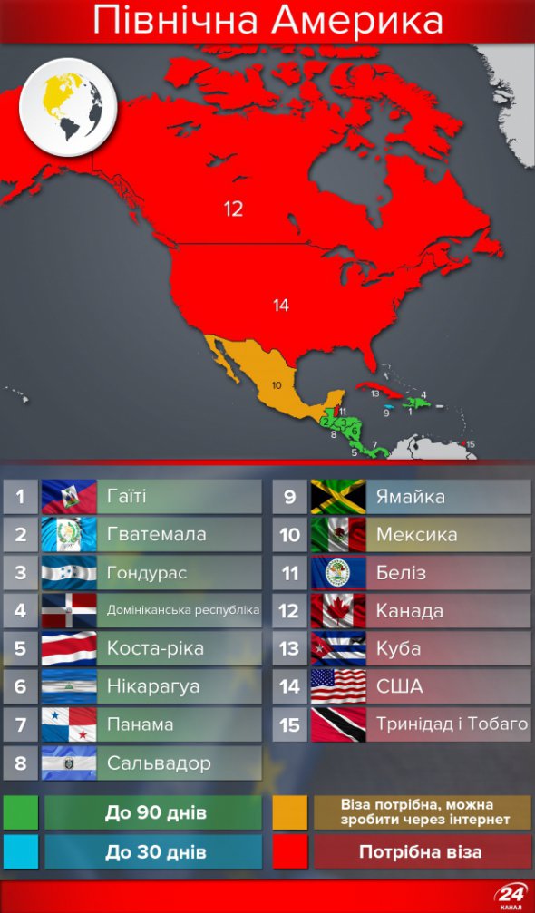 У Північній Америці без віз українець може потрапити в 15 країн. Візу в Мексику можна зробити через інтернет. Для США, Канади, Куби, Беліза та Тринідад і Тобаго потрібні в'їздні документи.