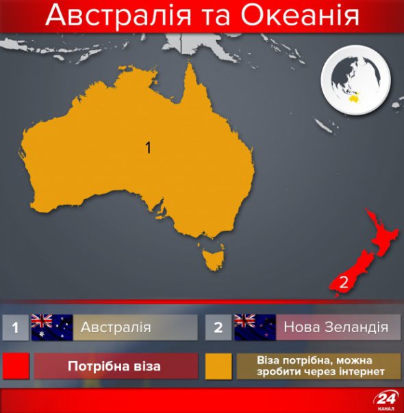 В Австралії та Океанії безвізовий режим діє з 3 острівними країнами: Фіджі, Мікронезія і Вануату. Австралійську візу можна замовити через інтернет. Отримати візу потрібно, щоб доїхати до Нової Зеландії.