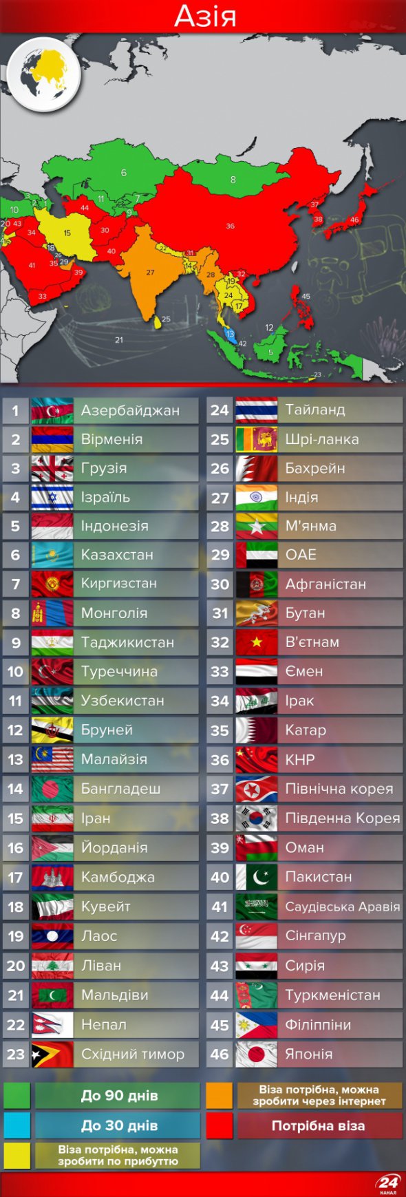 В Азії без віз можна заїхати у всі пострадянські країни в цьому регіоні, крім Туркменістану. Також безвізовими є 5 країн - Ізраїль, Туреччина, Монголія, Малайзія та Індонезія. Крім цього, в 12 країнах візу можна зробити після прибуття. Ще 4 країни вимагають візи, однак їх можна зробити через інтернет - Бахрейн, Індія, М'янма й Об'єднані Арабські Емірати.